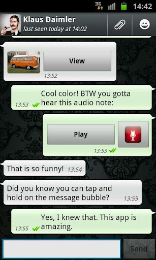 WhatsApp Messenger é um mensageiro de smartphones disponível para Android, BlackBerry, iPhone, Windows Phone e Nokia. WhatsApp usa seu 3G ou Wi-Fi para mensagens com amigos e familiares. Mudar de SMS para WhatsApp para enviar e receber mensagens, fotos, notas de áudio, vídeo e mensagens.